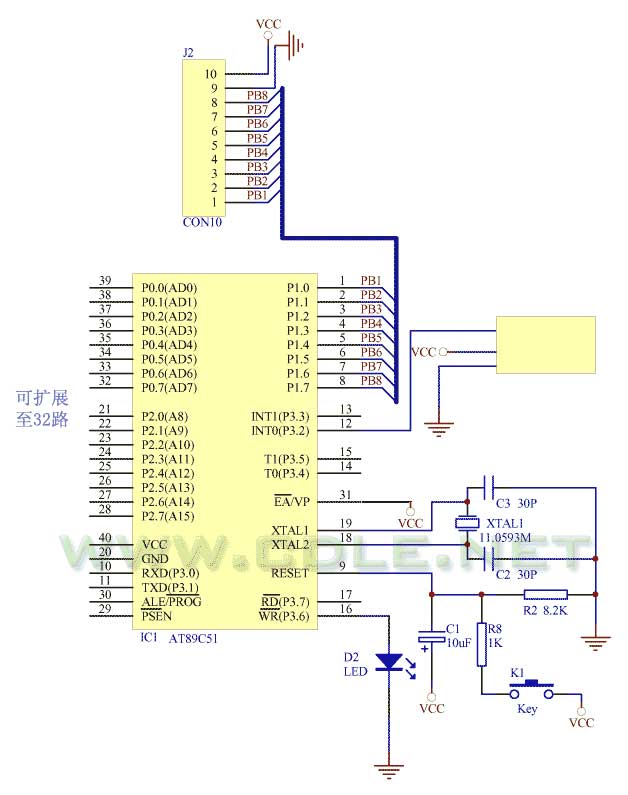 论坛上有一些朋友希望能DIY多路的红外遥控开关,我在此做了一个DOME版的,同样用我熟悉的SAA3010T的解码程序(省下了不少时间),程序可以直接用于AT89C51或AT89C2051或相容的芯片,用2051时,P1.0,P1.1要用10K电阻上拉。使用一体化接收头时电源方面一定要做好滤波,如用大的滤波电容使直流更加的稳定,用104(0.1uF)的小电容去掉高频等等,只有这样才能在一定程序上提高抗干扰性。在程序方面,我这里做的很简单,用了遥控器的1-8号键做1-8的继电器控制,按一下为继电器通,再按一下为继,二次按键的间隔时间大约在1秒钟,这样就可以避免按一次键会使继电器返复通断(按一次键的时间不定发送键值的次数也不定)。还用了遥控的电源按键,按下时所有断电器关闭。这个电路如果使用AT89C51的话可以找到32路或更多的控制。有网友说要做兼容多遥控学习型的,我想也是可行的,那会用到IC2器件,存储收到的数据做为学习,接收时再对比对,但是如果你的数据较多的话会造成速度慢等问题。我个人认为还是用专一的遥控器好点,比如说你用电视遥控去遥控电视和红外开关,当你要开电视或许同时会触发到红外开关。