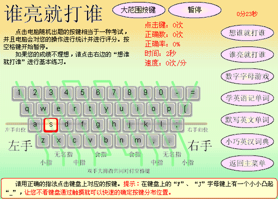 电脑打字功能中的谁亮就打谁。记得我初学电脑时,总是对键盘上“密密码码”的按键感到头痛,在键盘上寻找某个按键还要找半天是常有的事。这个打字功能可以帮助初学电脑的人练习盲打。虽然该类型的软件特别多,但是象本FLASH这么小体积、不需安装、即开即用的还真是少见!