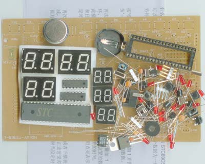 本套件配件:板1块(长度150MM×宽度100MM);写好程序的芯片一片,其它元件,元件清单,制作调试说明。定时控制功能演示板。演示板可以看作是一个带6位日期显示的6位数字电子钟和8路开关控制,关于本板的详细操作以及说明请看下面: