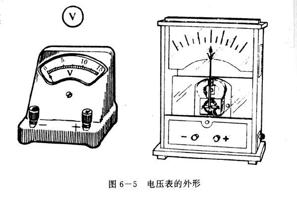 侧是电路两端的电压,要用电压表.电压表也有很多种,图6-5给出了几种电压表的外形,图中左上角是电压表在电路图中的符号.